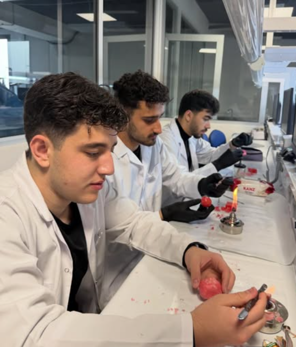 Ayrıca, silikon ölçülerden elde edilen alçı modeller üzerinde gerçekleştirilen uygulamalarla, protezlerin fonksiyonel ve estetik açıdan ağız içinde kullanıma uygun hale getirilmesi sağlanmaktadır. Böylece öğrenciler, protez üretim sürecinin önemli aşamalarını uygulamalı olarak öğrenerek mesleki bilgi ve becerilerini geliştirme imkânı bulmaktadır.